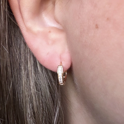 Uma argola delicada, banhada em ouro 18k, com fileira de zircônias que proporcionam um brilho discreto e sofisticado. Seu tamanho pequeno a torna perfeita para quem busca um visual minimalista sem abrir mão do glamour.