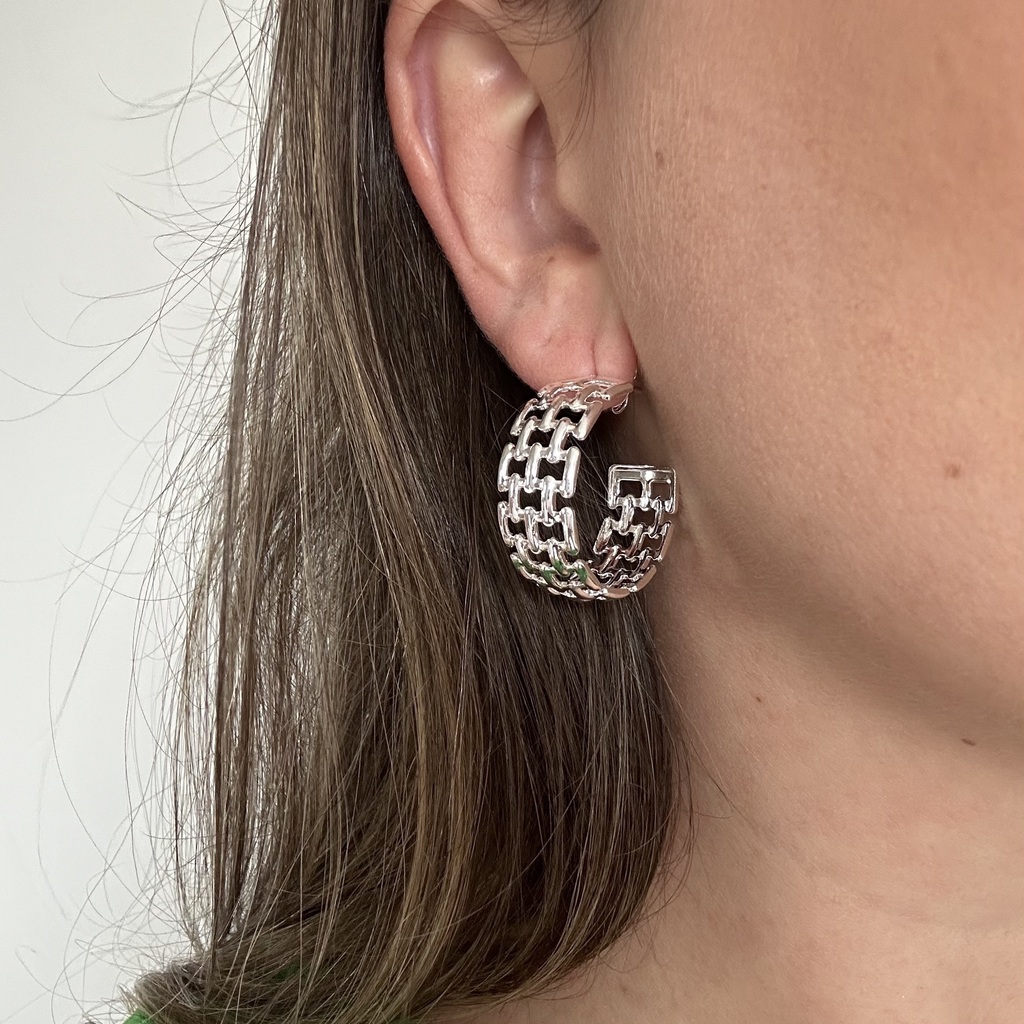 Este brinco argola traz um design arrojado e moderno, com efeito tela vazada, todo banhado em prata de alto brilho. Uma peça impactante, que mistura delicadeza e presença, ideal para mulheres que gostam de joias exclusivas e cheias de personalidade.